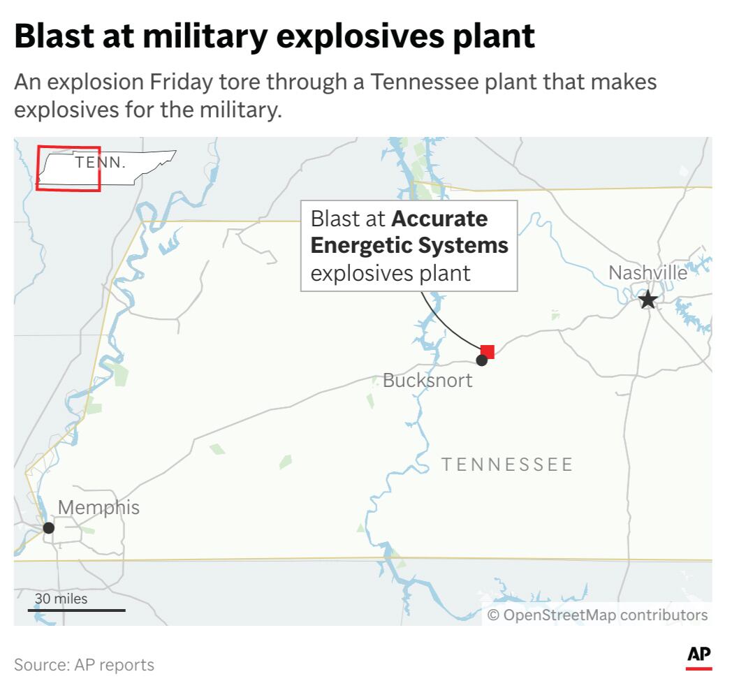 The company’s website says it processes explosives and ammunition at an eight-building facility that sprawls across wooded hills in the Bucksnort area, about 60 miles (97 kilometers) southwest of Nashville. It’s not immediately known how many people work at the plant or how many were there when the explosion happened.