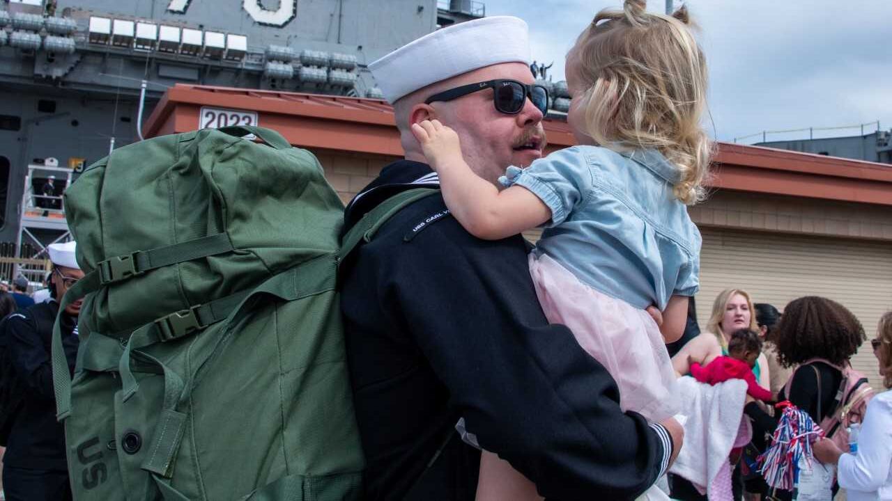 The photo by U.S. Navy Mass Communication Specialist 1st Class Tyler R. Fraser shows Logistics Specialist 2nd Class Chris Lorey hugging his daughter.