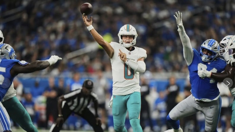 DETROIT — Rookie quarterback Quinn Ewers and wide receiver Theo Wease Jr. connected for two touchdowns, helping the Miami Dolphins top the Detroit Lions 21-17 in their preseason matchup at Ford Field on Saturday afternoon.