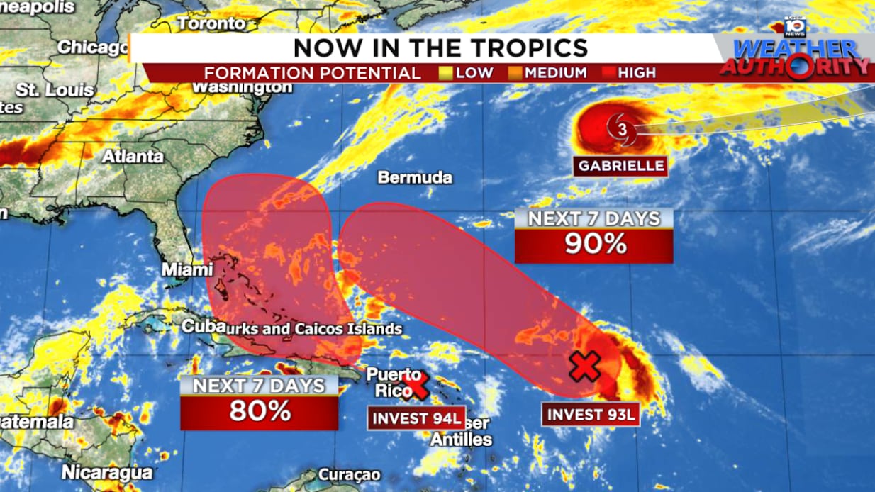 Two vigorous tropical disturbances – designated Invest 93L (easternmost disturbance) and Invest 94L (westernmost disturbance) – are likely to develop in the coming days and could bring impacts to land, with the westernmost system tracking through the Bahamas and near Florida, Georgia, and the Carolinas for early next week.
